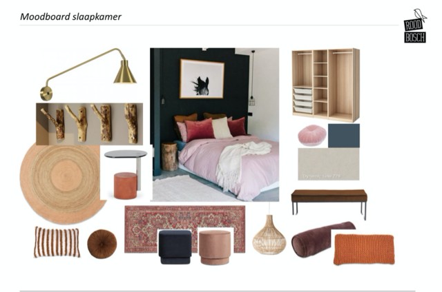 Heb je behoefte aan een kloppend geheel. Vind je het lastig keuzes te maken Voorkom miskopen en maak gebruik van een moodboard, dit sfeerbord is de leidraad voor je interieur. In dit moodboard vindt je juiste sfeer kleur en vorm en materiaalkeuze. Zet hem op je telefoon zodat je hem overal bij je hebt. En voorkom verdere miskopen. Heb je behoefte aan kleur in je huis maar je weet niet hoe je het moet toepassen. Welke wand is geschikt voor een kleur en welke kleur past binnen mijn interieursmaak. Kan ik in mijn kamer op het noorden een donkere kleur toepassen, en wat doe ik dan met mijn kozijnen en het plafond. Misschien wil ik wel behang, maar waar en hoe en welke print. Welke raambekleding past het beste bij mijn ramen. Wil ik inkijk of juist verduisterend. Welke gordijnen passen mooi bij mijn vloer en de rest van mijn interieur.